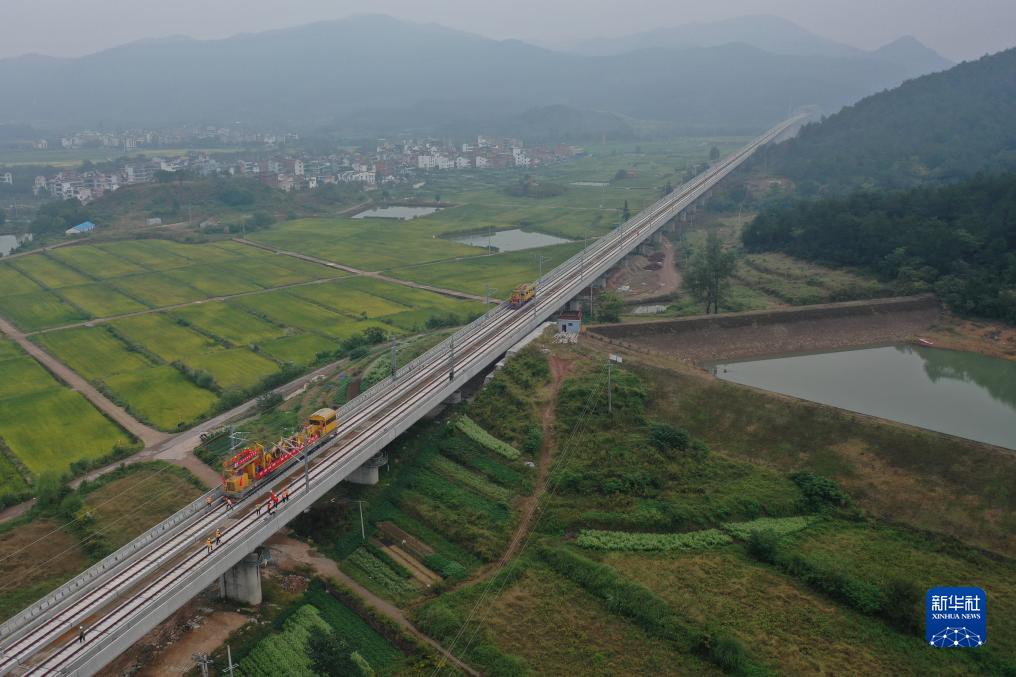 10月10日,中国中铁电气化局施工人员在杭温铁路上进行接触网导线架设作业(无人机照片)。