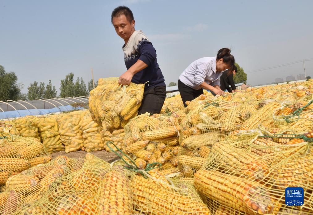 金秋时节,河北各地秋粮进入大面积收获期,农民利用晴好天气开展秋粮晾晒、收储等工作,确保秋粮入仓。