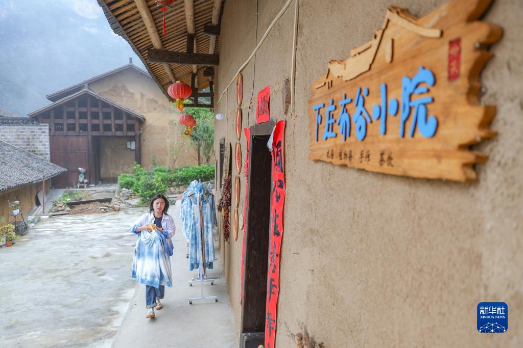 10月10日,在重庆市巫山县竹贤乡下庄村,袁孝鑫将晾干的扎染产品取进屋内。
