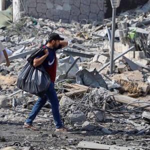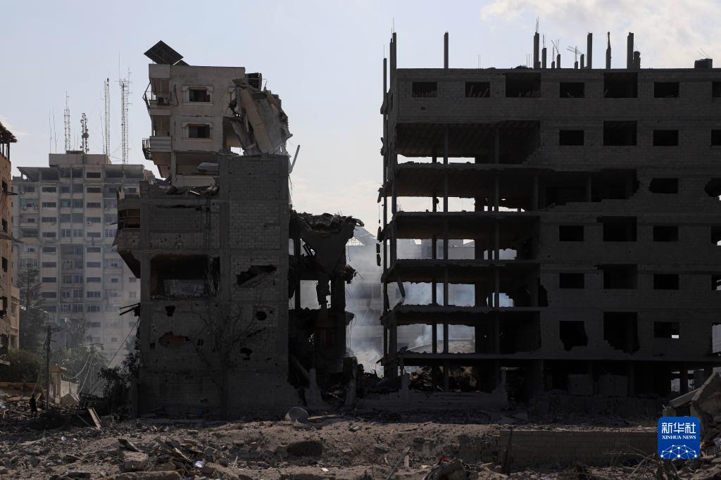 这是10月10日在加沙城拍摄的被以色列空袭炸毁的建筑废墟。