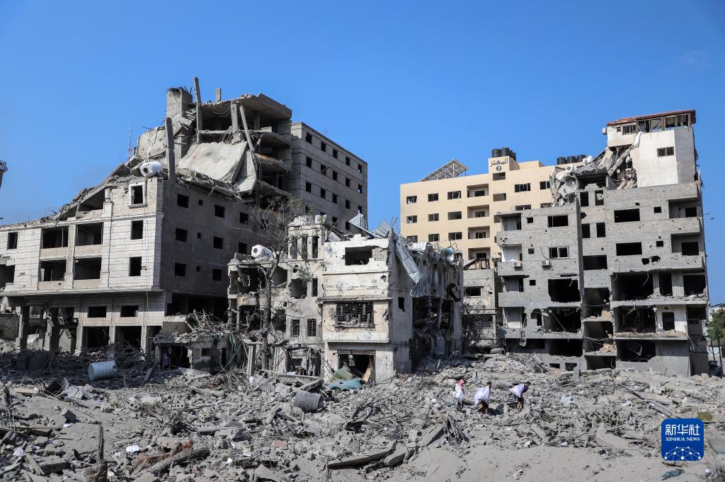 这是10月10日在加沙城拍摄的被以色列空袭炸毁的建筑废墟。
