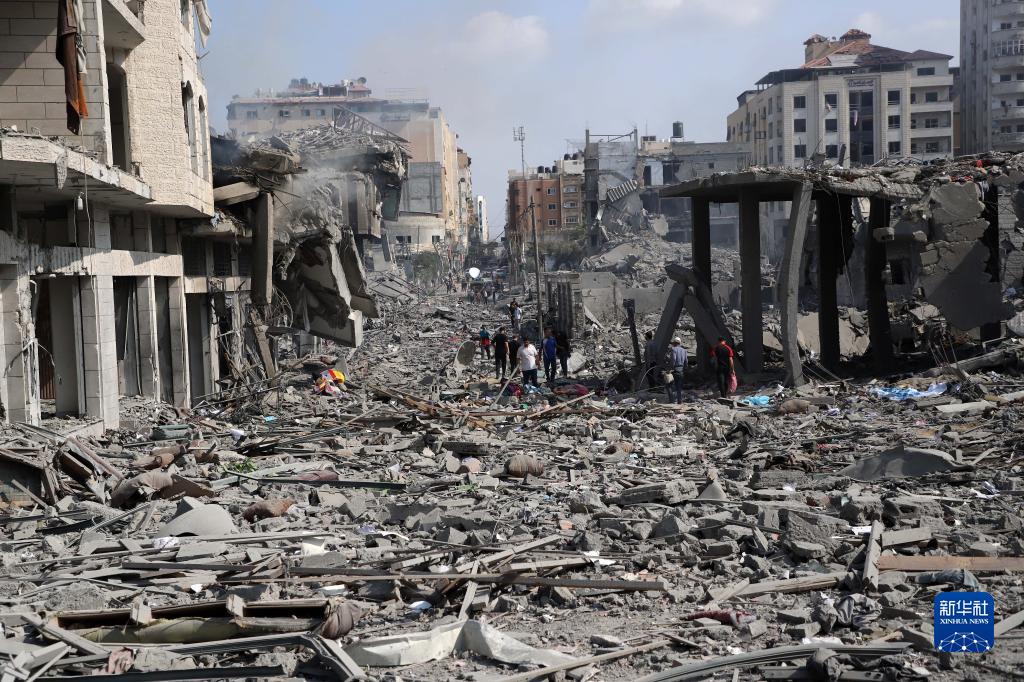 10月10日,在加沙城,人们查看被以色列空袭炸毁的建筑废墟。