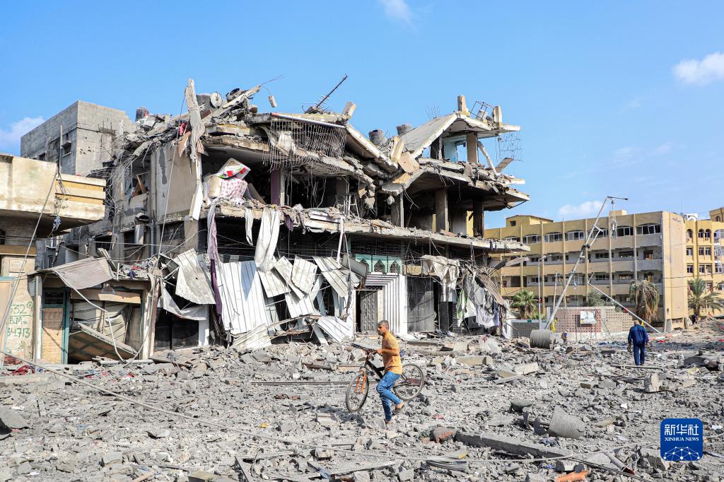 10月10日,在加沙城,人们走过被以色列空袭炸毁的建筑废墟。