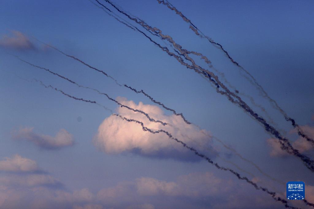 这是10月10日在加沙城拍摄的向以色列发射的火箭弹留下的烟迹。