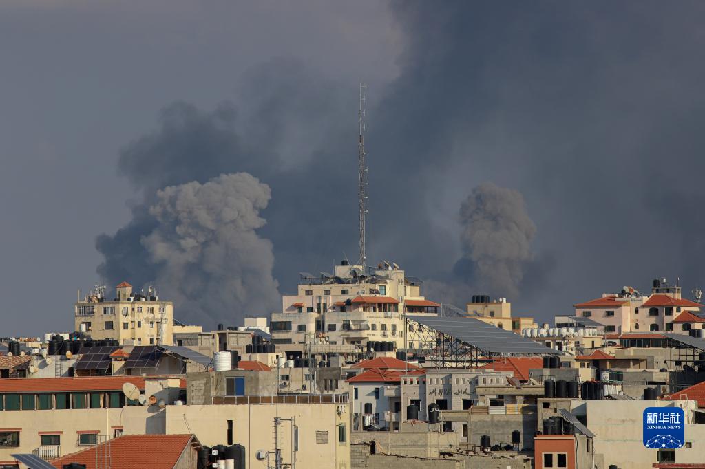 10月10日,加沙城的建筑遭以色列空袭后升起浓烟。