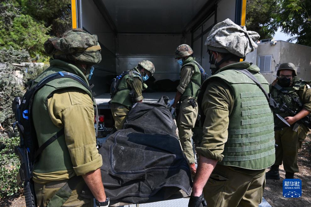 10月10日,以军在以色列南部卡法阿扎基布兹搬运尸袋。