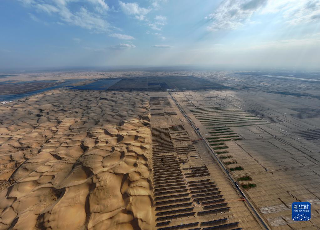 这是10月10日拍摄的建设中的库布其沙漠鄂尔多斯中北部新能源基地(无人机合成照片)。