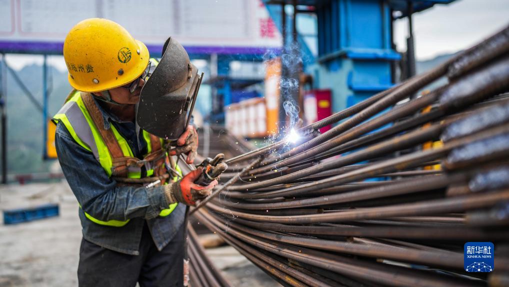 工人在纳晴高速六枝特大桥项目现场进行施工(10月9日摄)。