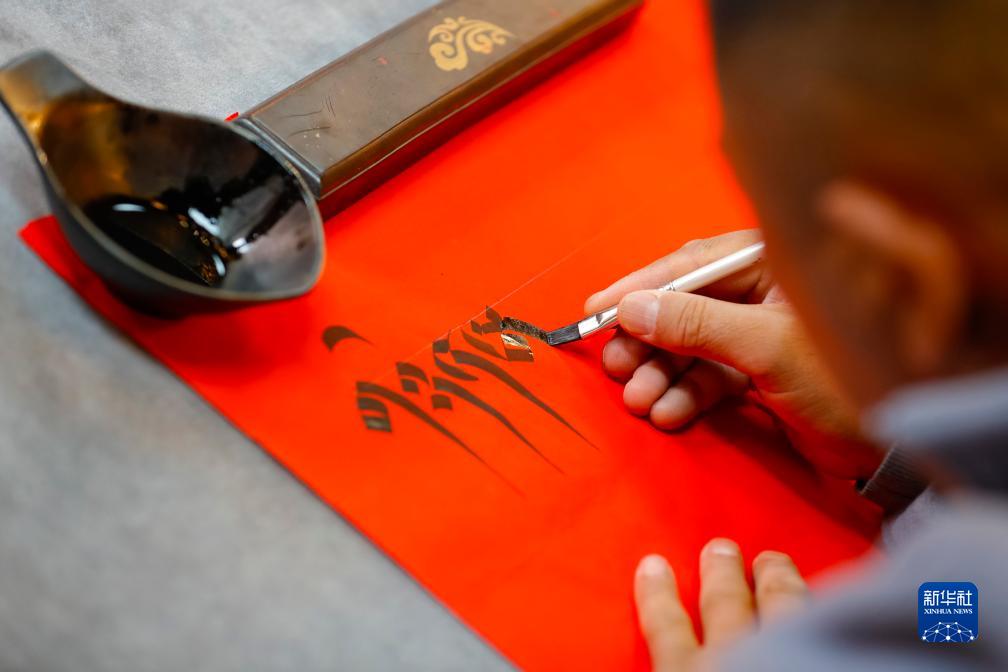 10月10日,在四川甘孜藏族自治州理塘县,藏族书法家昂旺曲批为一对新人书写藏文书法作品。