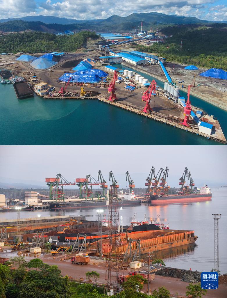 拼版照片显示,上图:这是2016年9月23日在印度尼西亚中苏拉威西省拍摄的青山工业园自备码头(新华社记者 杜宇 摄);下图:这是2022年9月23日在印度尼西亚中苏拉威西省拍摄的中国印尼综合产业园青山园区港口(新华社记者 徐钦 摄 )。