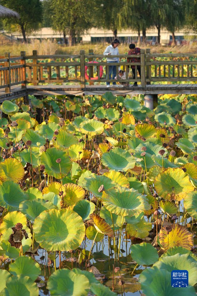 10月10日,游客在山东聊城位山黄河公园里游览。