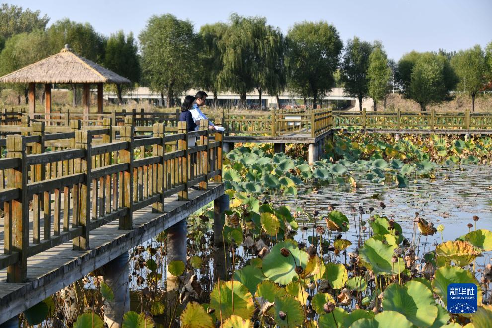 10月10日,游客在山东聊城位山黄河公园里游览。