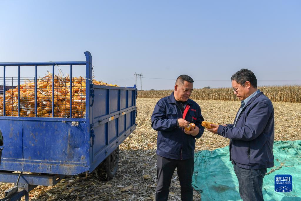 10月11日,在吉林省公主岭市范家屯镇孟家村,正高级农艺师邱英楠(右)向乾程农民专业合作社理事长王成了解秋收情况。