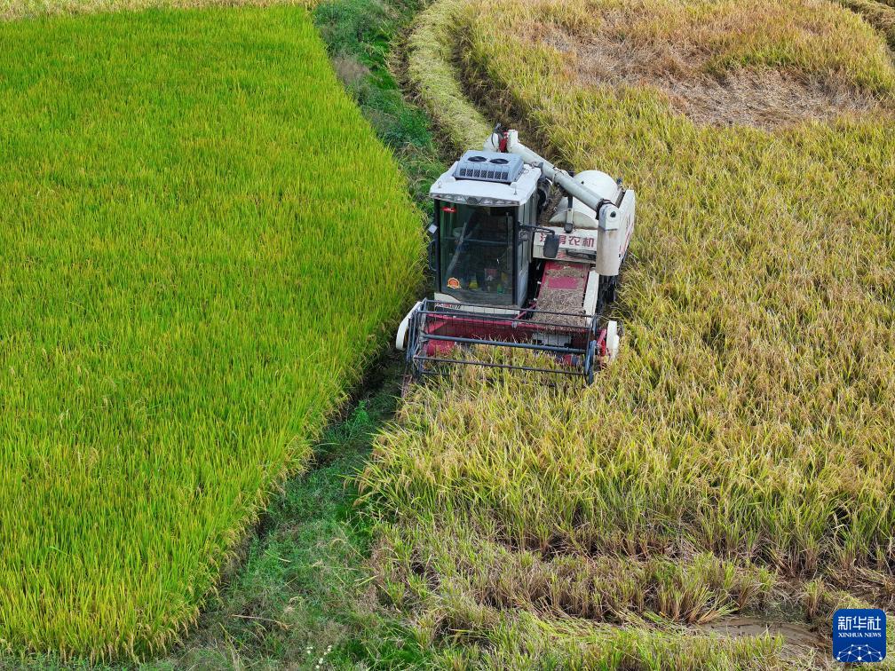 金秋时节,湖南省长沙市望城区乌山街道维梓村种植的中稻迎来收获季,当地农户抢抓农时收割水稻、烘干稻谷,确保颗粒归仓。