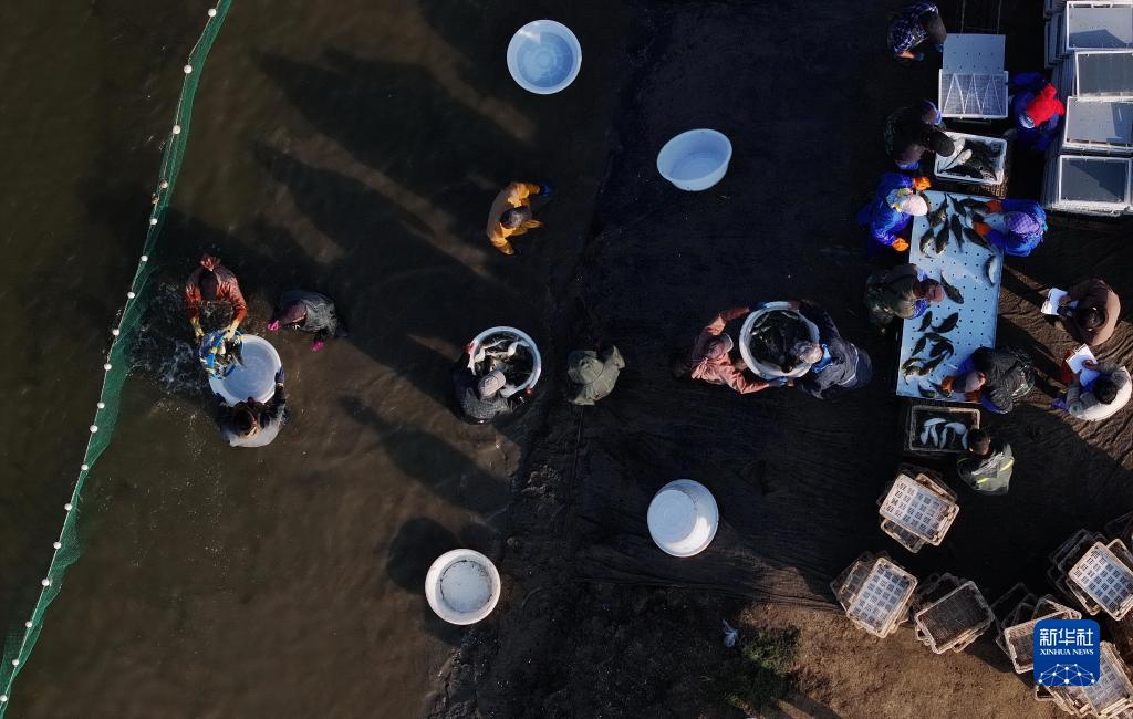 10月11日,唐山市曹妃甸区柳赞镇一家河豚鱼养殖合作社的社员在池塘捕捞河豚鱼(无人机照片)。