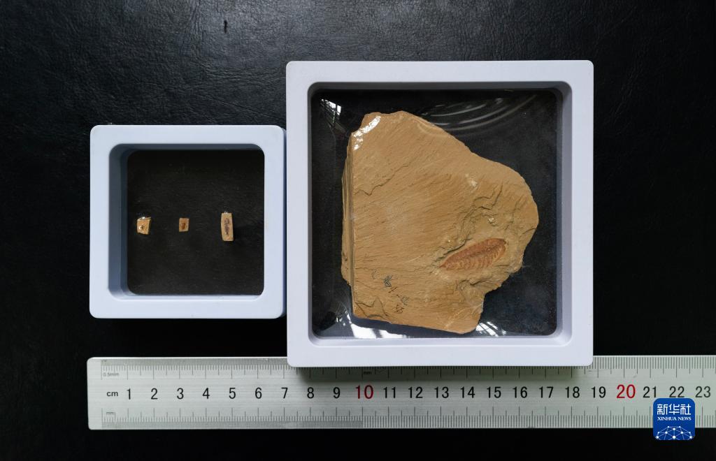 这是10月11日在云南大学古生物研究院实验室里拍摄的名为迷人林乔利虫的化石,从左到右为不同生长时期的迷人林乔利虫。