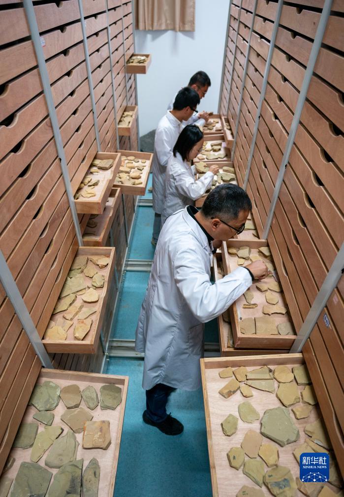 10月11日,云南大学古生物研究院研究员刘煜(前)带领学生在化石存放库里挑选化石。