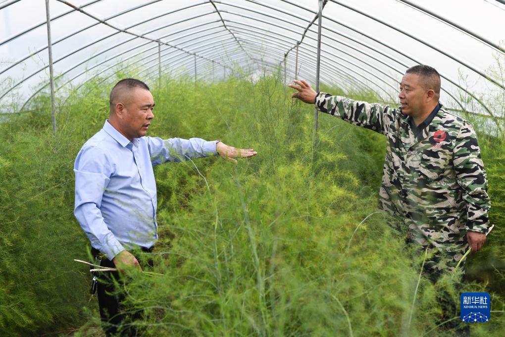 10月11日,在涟水县红窑镇金城村,淮安市人大代表郑标(左)给芦笋种植户传授管护知识。郑标是当地芦笋种植大户,带领许多村民走上种植芦笋之路。