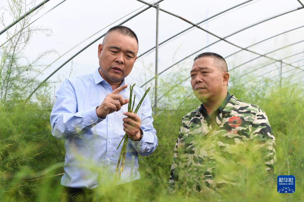10月11日,在涟水县红窑镇金城村,淮安市人大代表郑标(左)给芦笋种植户传授管护知识。郑标是当地芦笋种植大户,带领许多村民走上种植芦笋之路。