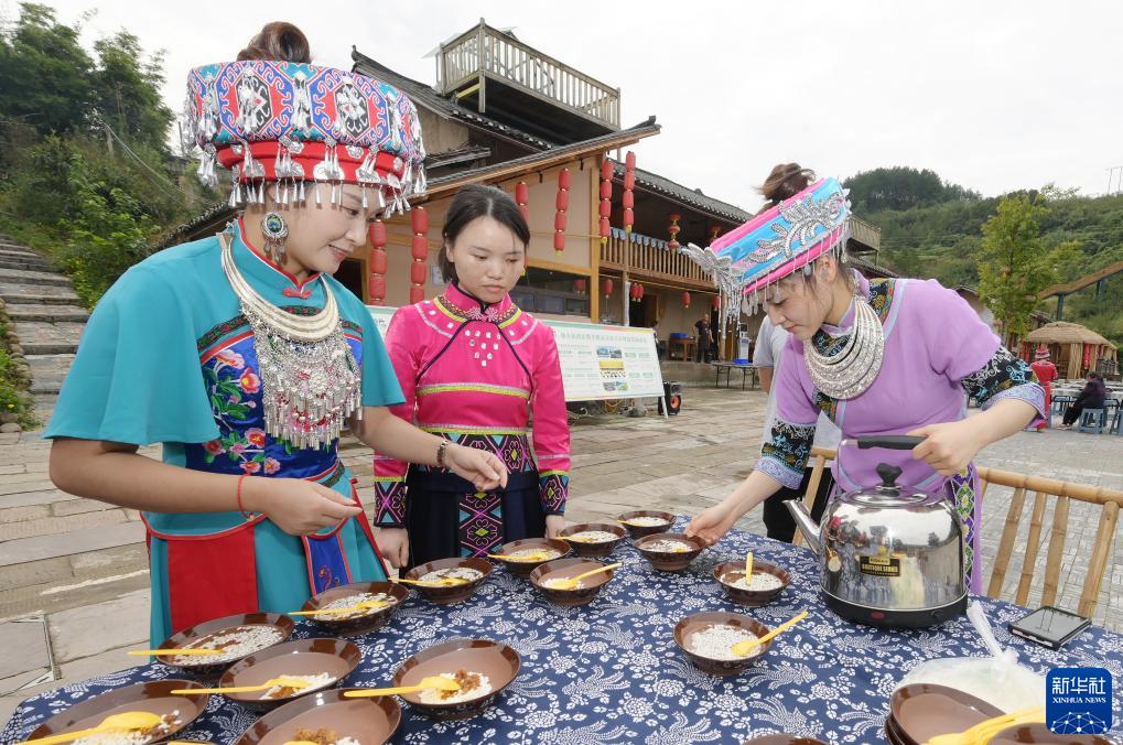 10月10日,在重庆市石柱土家族自治县桥头镇的陶然居瓦屋小寨,当地村民身着民族服装为游客准备当地特色饮品“米米茶”。