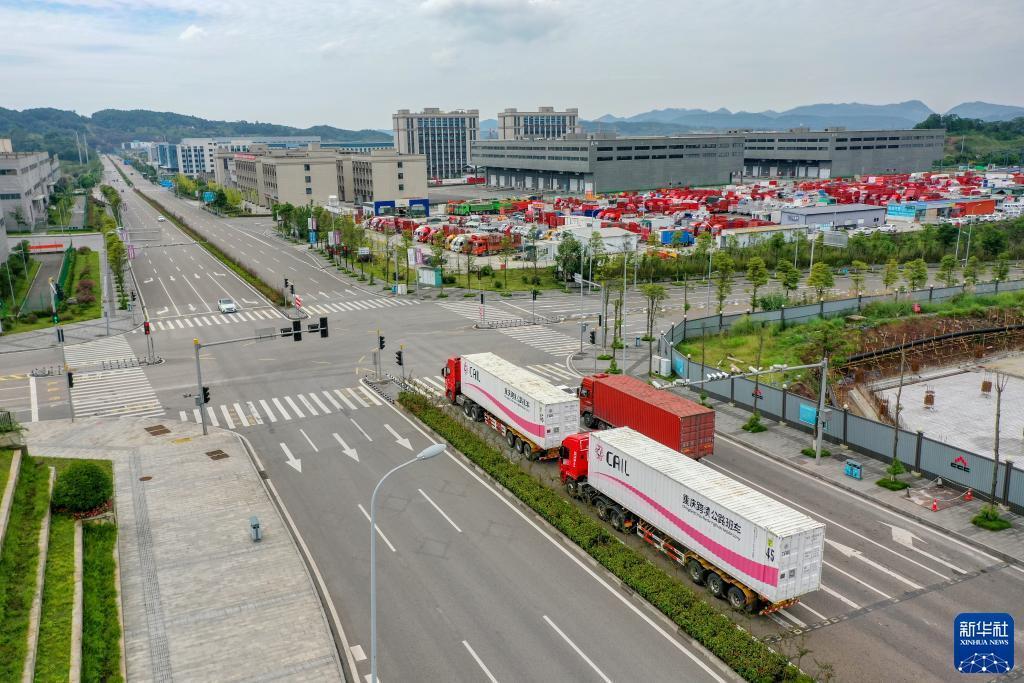 10月11日,满载笔记本电脑配件、发电机组件等产品的西部陆海新通道跨境公路班车从重庆南彭公路保税物流中心驶出,将途经广西凭祥,直达越南(无人机照片)。
