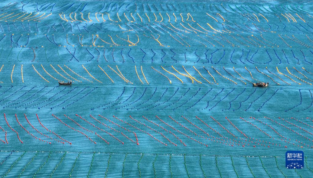 金秋时节,在山东省荣成市,各大海洋牧场海上养殖区一派繁忙景象,渔民驾驶渔船、舢板出海作业,在碧海上“绘”出一幅幅秋日渔耕图。