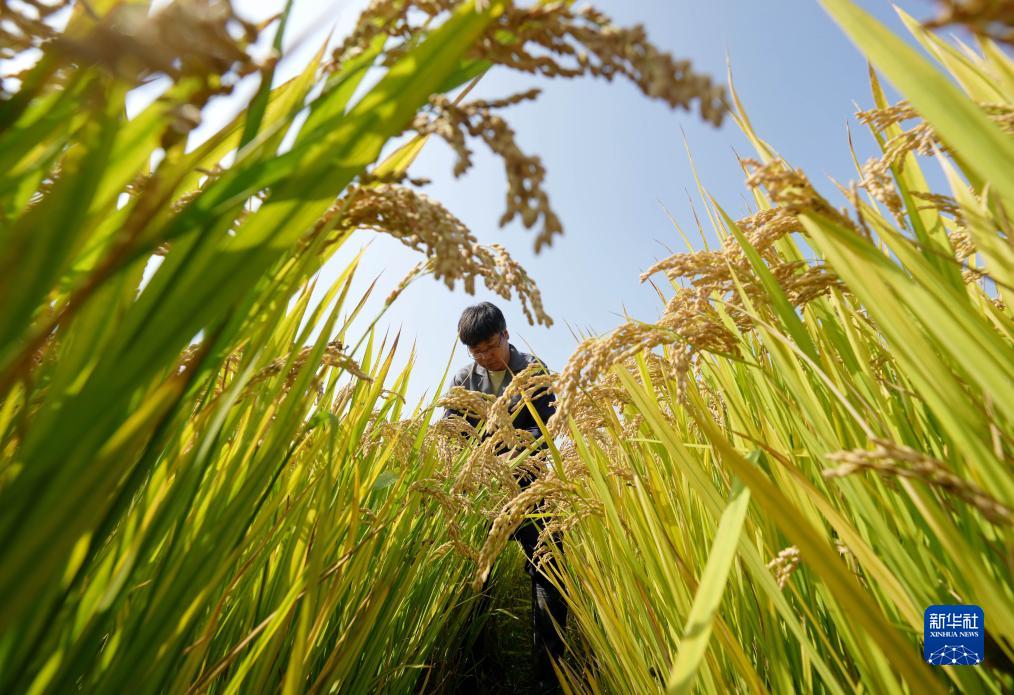 10月11日,农业科研人员在河北省唐山市曹妃甸区第五农场盐碱地改良而成的高标准稻田内工作。
