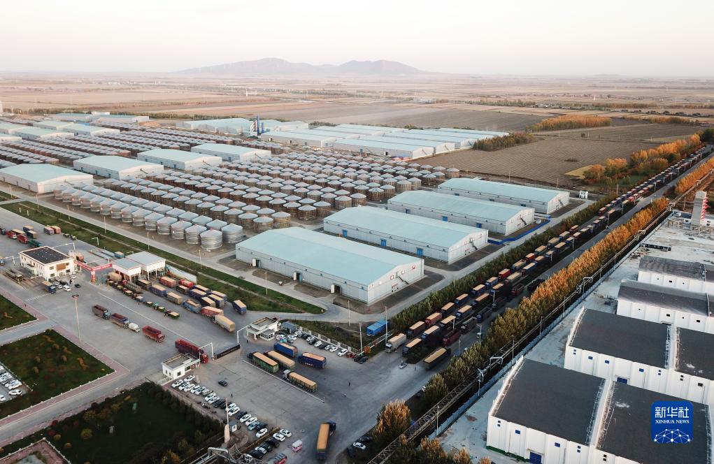 10月11日,送粮车在黑龙江省富锦市一大型粮食仓储加工企业外排起长队(无人机照片)。