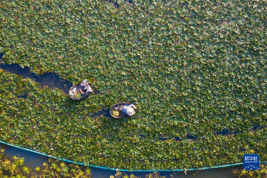 10月12日清晨,种植户划着菱桶采摘南湖菱(无人机照片)。