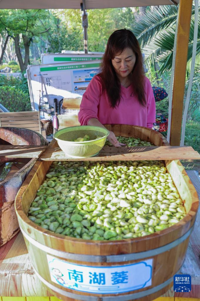 10月12日,在南湖边的南湖菱销售点,工作人员在整理刚刚采摘来的新鲜南湖菱。