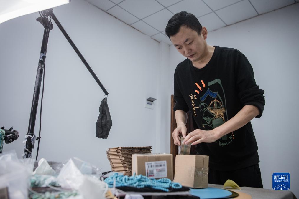 10月11日,湖北省郧西县下营村村民钟磊将绿松石制品打包准备发货。
