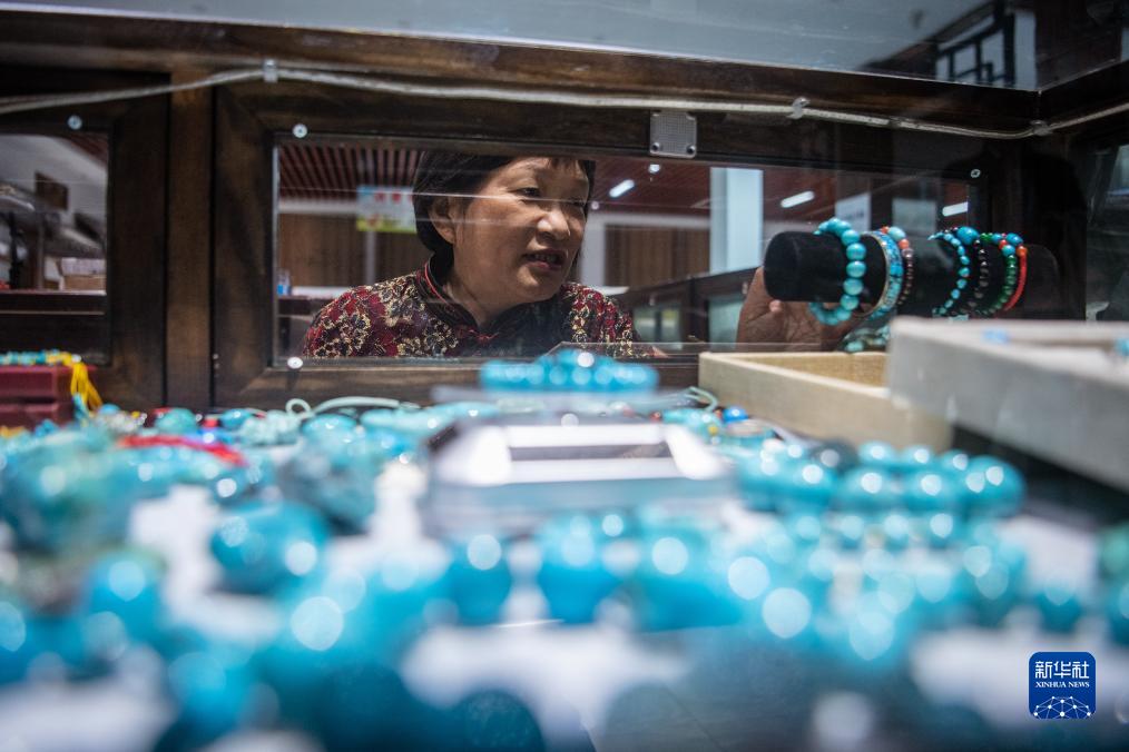 10月11日,湖北省郧西县下营村村民郭明凤在介绍自己展销柜台内的绿松石制品。