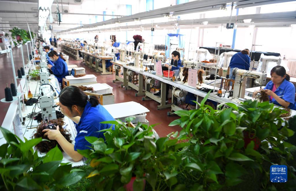 10月11日,工作人员在河南瑞贝卡发制品股份有限公司的生产车间里制作假发。