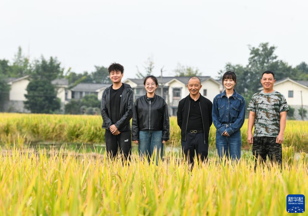 10月10日,在成都崇州市隆兴镇,王伶俐(右二)、父亲王志全(右三)和杨柳土地股份合作社的青年同事在水稻田旁合影。