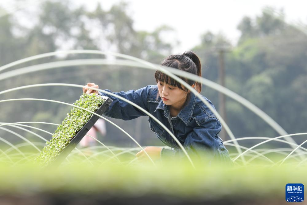 10月10日,在成都崇州市隆兴镇,王伶俐在查看油菜苗的培育情况。