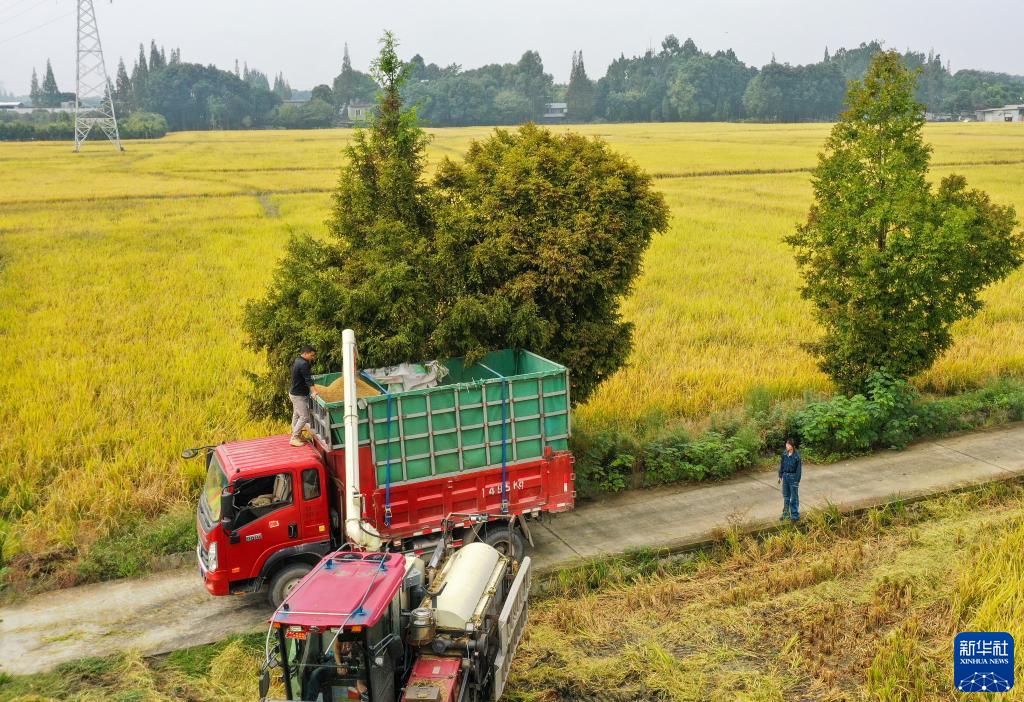 10月10日,在成都市双流区彭镇,王伶俐(右)在查看水稻收割后的装车情况(无人机照片)。