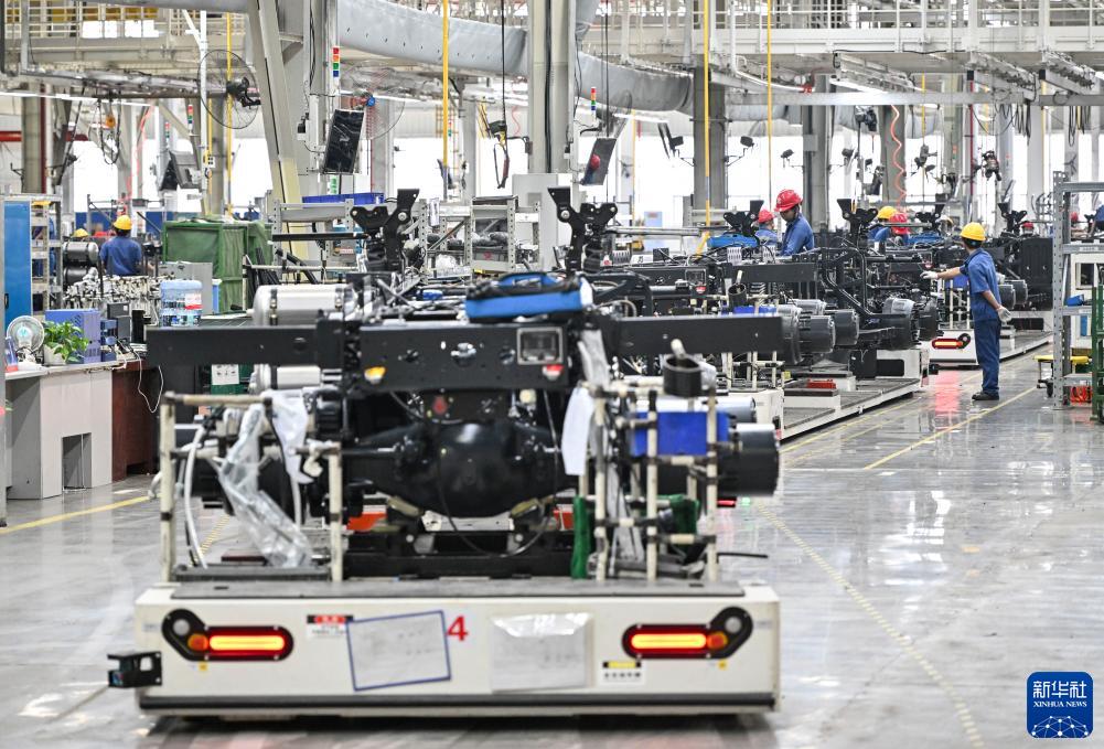9月26日在位于重庆市两江新区的上汽红岩汽车有限公司总装车间拍摄的生产作业现场。