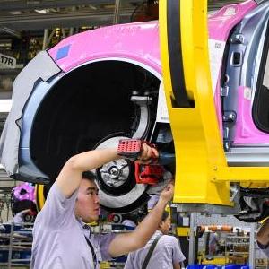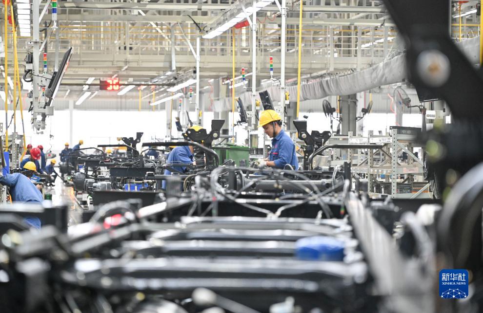 9月26日,工作人员在重庆市两江新区的上汽红岩汽车有限公司总装车间作业。