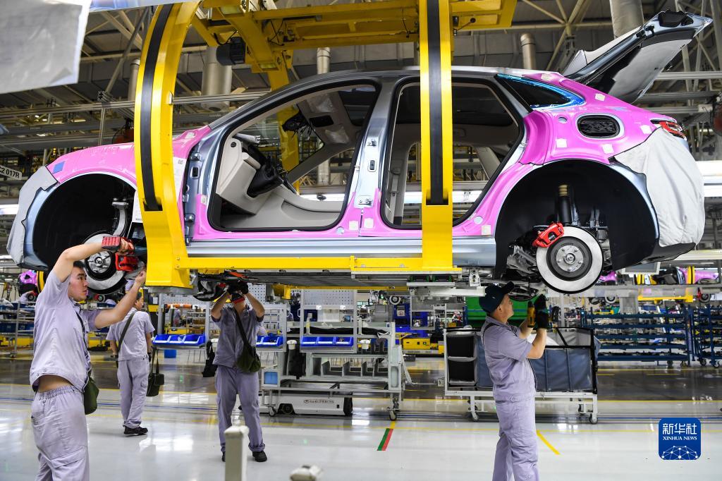 赛力斯汽车有限公司重庆两江智慧工厂工作人员在生产车间作业(2022年6月27日摄)。