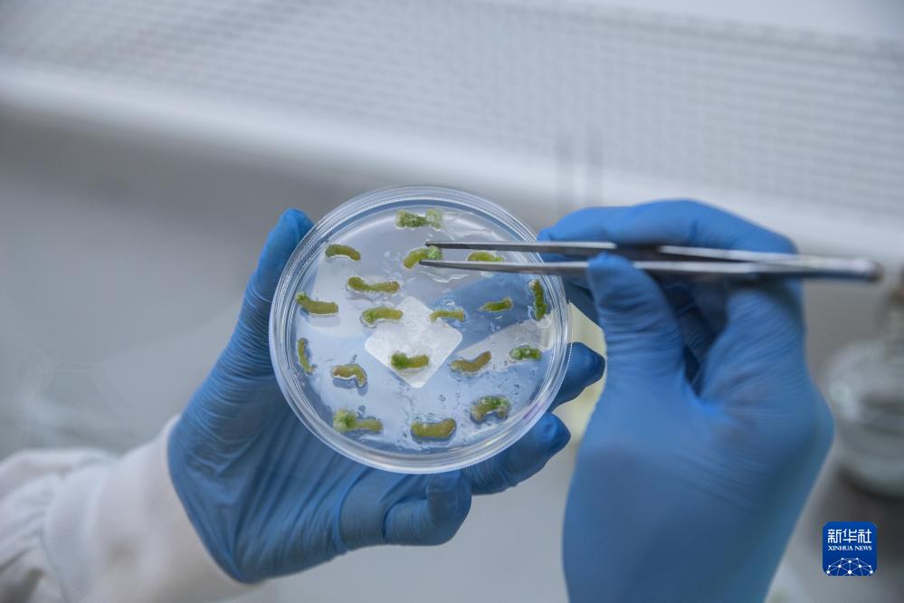 10月11日,一名科研人员在位于巴西圣保罗州克拉维纽斯的隆平巴西分子生物实验室内查看育种繁育情况。