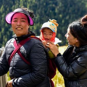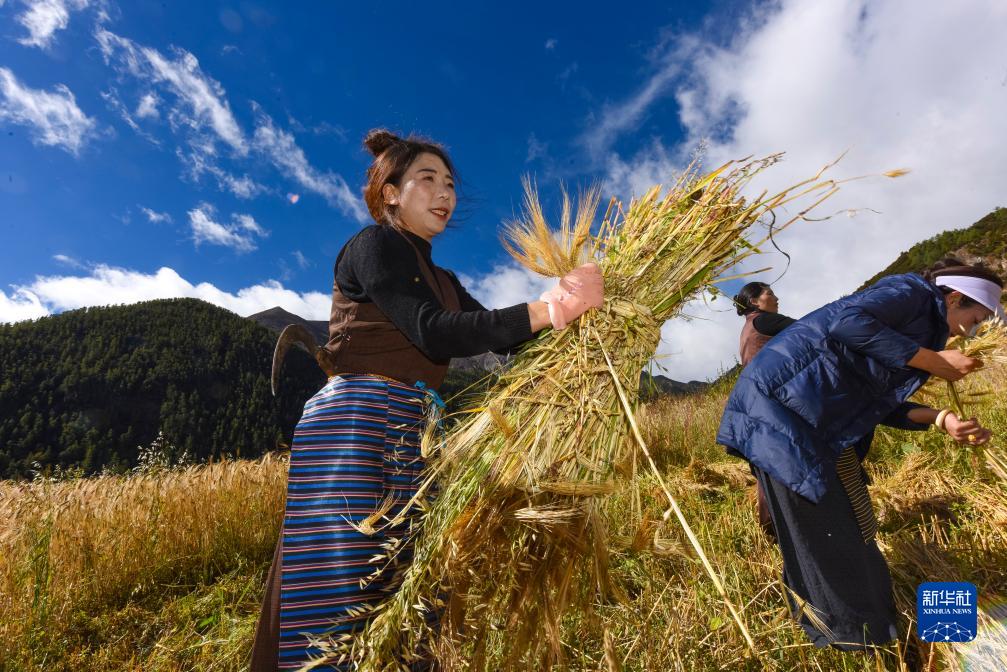 10月12日,在四川甘孜藏族自治州稻城县亚丁村,村民泽仁拉姆(左一)在收割青稞。