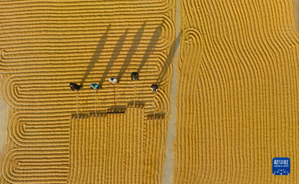 10月12日,在灯塔市禾谷茂源水稻种植专业合作社,农民在晾晒收获的水稻(无人机照片)。