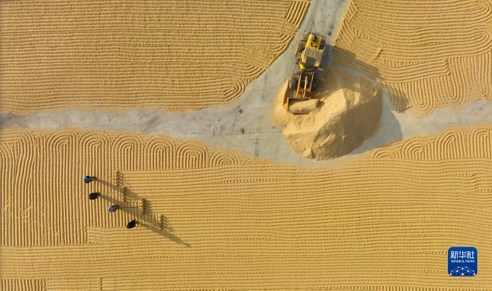 10月12日,在灯塔市禾谷茂源水稻种植专业合作社,农民在晾晒收获的水稻(无人机照片)。