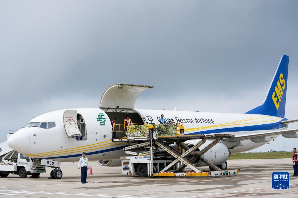 重庆巫山机场工作人员为停机坪上的第二季“脆李航班”首趟货机装载新上市的巫山脆李(2023年6月28日摄)。重庆市巫山县位于三峡库区腹地,是“中国脆李之乡”。过去因为物流不便,巫山脆李经过几天的运输后往往会影响品质和口感。随着航空快递的开通,让巫山脆李可以快速走向全国以及包括新加坡在内的国际市场。
