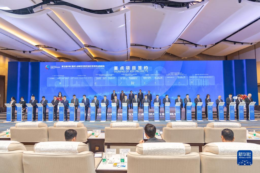 这是2023年4月20日在重庆市第五届中新(重庆)战略性互联互通示范项目金融峰会开幕式现场拍摄的重点项目签约仪式。