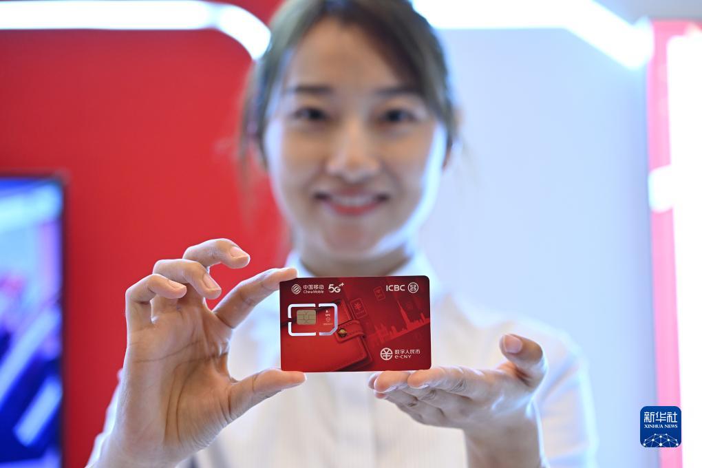 在论坛设置的数字人民币体验区,工商银行展台的工作人员展示一款工商银行与中国移动联合研发的数字人民币SIM卡硬钱包(10月12日摄)。该硬钱包支持无网无电支付。