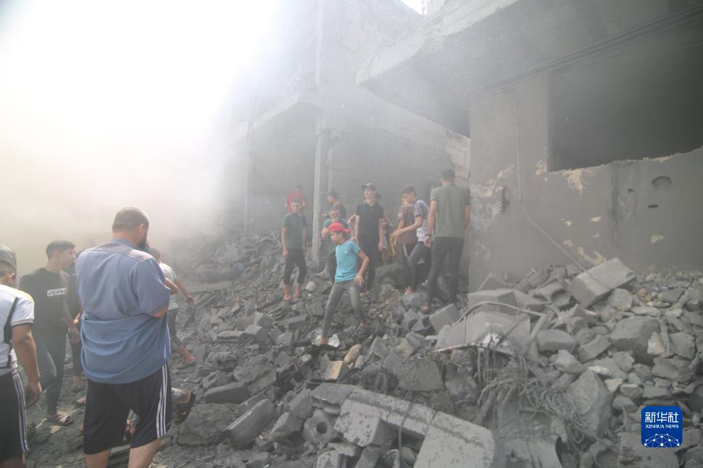10月12日,在加沙地带南部城市拉法,人们查看遭以色列空袭的受损建筑。