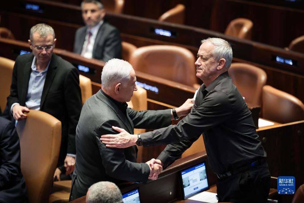10月12日,在耶路撒冷,以色列总理内塔尼亚胡(左)与前国防部长甘茨出席特别会议时握手。