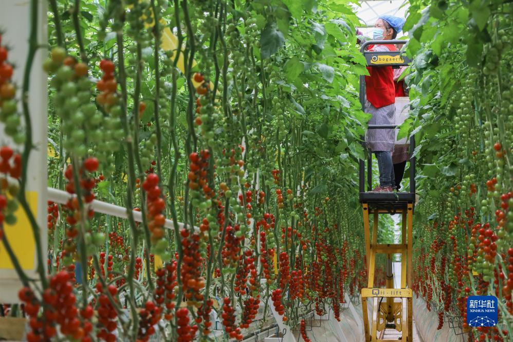 近日,在甘肃省平凉市崆峒区四十里铺镇的智能玻璃温室里,采用基质吊架立体栽培系统等技术培育的串收番茄陆续成熟,务工人员忙着收获、打包,准备进行销售。近年来,平凉市着力发展设施蔬菜产业链,不仅为市场提供了高品质产品,还帮助群众实现就近就业。
