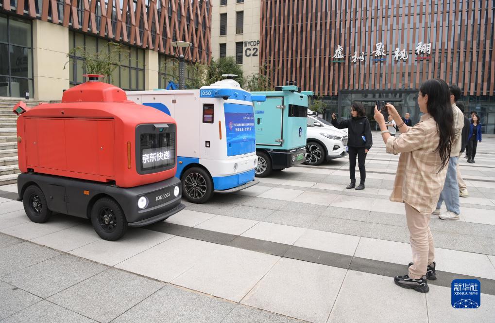 10月11日在重庆永川大数据产业园拍摄的对外展示的无人驾驶环卫车、无人配送车等智能车辆。